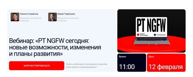 Вебинар расскажет о последних обновлениях PT NGFW, новых возможностях, влиянии на эксплуатацию инженеров и планы развития.
