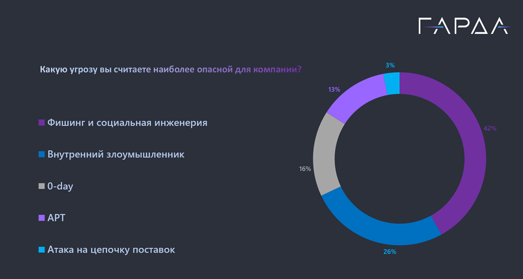Представители российского бизнеса и государственных организаций считают фишинг и социальную инженерию основной угрозой для компаний. На втором месте, так считают четверть респондентов, — действия инсайдеров. При этом 16% видят угрозу в атаках нулевого дня и 13% – в сложных АРТ. Атаки на цепочку поставок, которые в последнее время привели к ряду громких инцидентов в мире, назвали лишь 3% опрашиваемых.