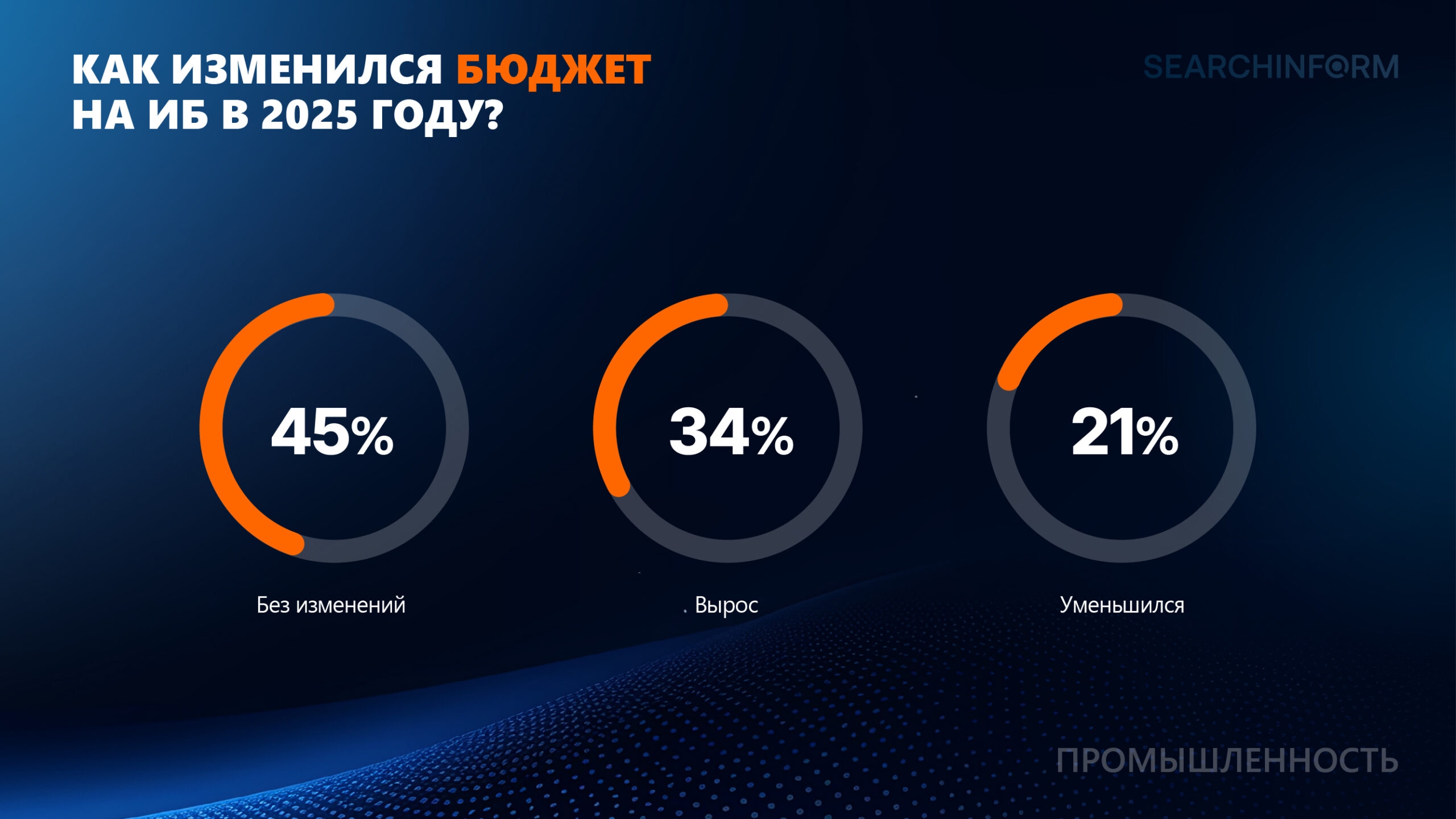 В 2025 в промышленном секторе выделяли средства на ИБ. Этому способствовали как экономические факторы, так и необходимость усилить защиту от рисков ИБ и соответствовать ужесточившимся требованиям регуляторов. 34% промышленных организаций увеличили бюджеты на информационную безопасность, 45% оставили бюджет без изменений, 21% решили сократить финансирование.