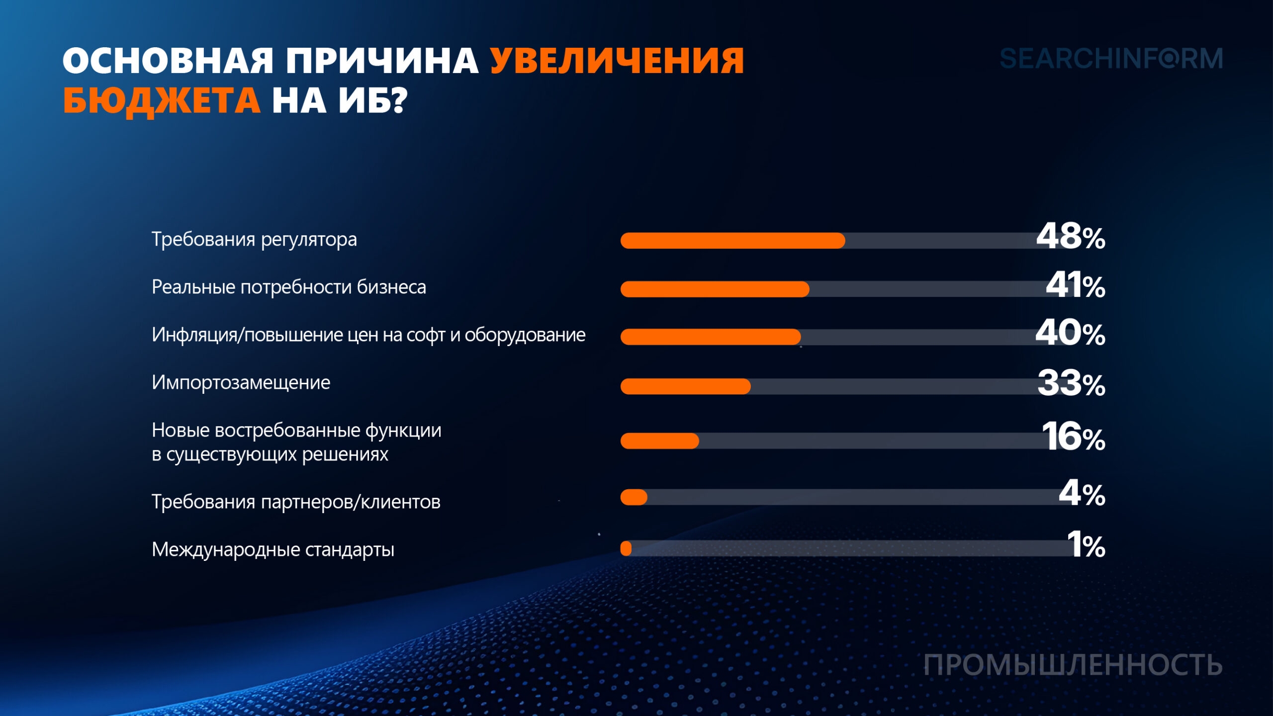 Рост ИБ-бюджетов в промышленности обусловлен несколькими факторами. На первом месте для промышленных организаций стоят требования регуляторов – 48% опрошенных отмечают, что нормативные требования стимулируют увеличение инвестиций в защиту данных и инфраструктуры. Еще один важный фактор для 41% опрошенных – реальные потребности в защите от киберугроз и обеспечении бесперебойной работы организации. Также для 40% компаний одной из причин является рост цен на ПО и оборудование из-за инфляции.