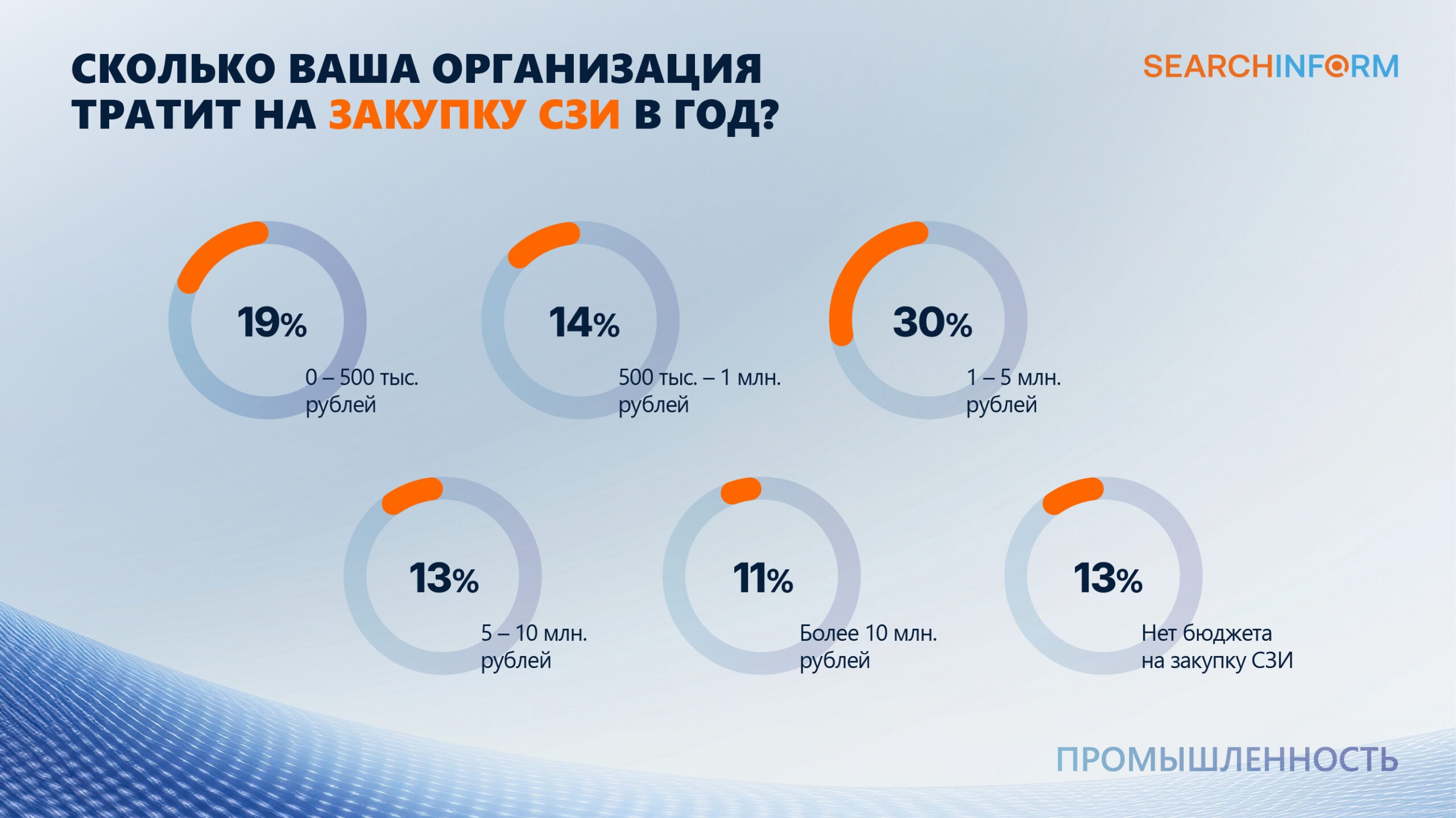 30% опрошенных промышленных организаций тратят на покупку защитных решений от 1 до 5 миллионов рублей в год. 10 и более миллионов рублей выделяют лишь 11% организаций. 13% организаций не располагают бюджетами на ИБ.