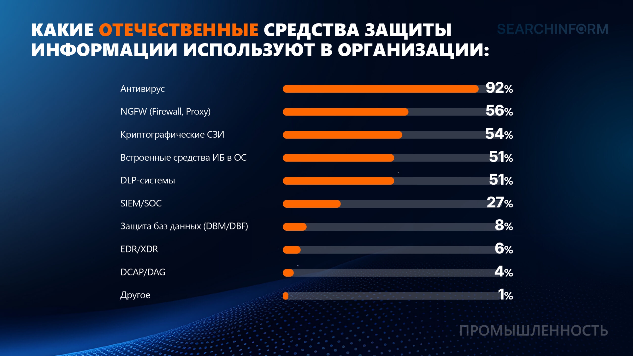 В рамках опроса эксперты «СёрчИнформ» проанализировали, какие российские средства защиты информации используют организации из сферы промышленности. В 92% опрошенных предприятий внедрены российские антивирусные системы. Более половины организаций используют отечественные NGFW (56%), криптографические СЗИ (54%), встроенные средства ИБ в ОС (51%) и DLP-системы для защиты информации от утечек (51%). Лишь 27% опрошенных используют отечественные SIEM-системы и SOC.*