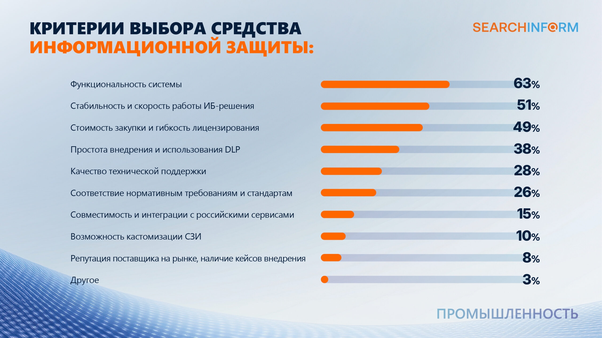 Промышленные организации при выборе СЗИ в первую очередь ориентируются на функциональность решений – 63%. Не менее важным для половины компаний (51%) является стабильность и скорость работы ИБ-решения. Также одним из основных критериев выбора СЗИ 49% заказчиков назвали стоимость закупки и гибкость лицензирования.*