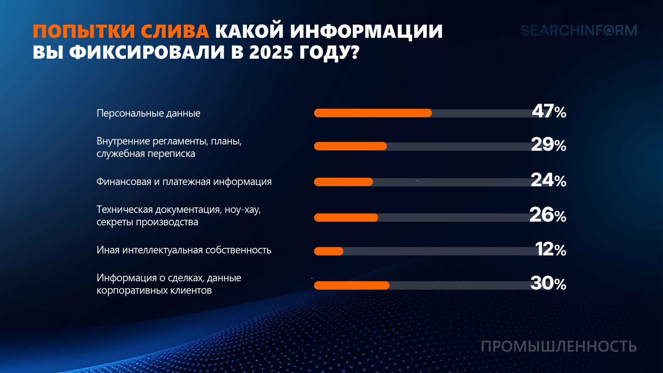Чаще всего в 2025 году компании сталкивались с попытками слива персональных данных (47%), информация о сделках, данные корпоративных клиентов (30%), внутренние регламенты, планы, служебная переписка (29%), техническая документация, ноу-хау, секреты производства (26%). Об утечках финансовой информации и интеллектуальной собственности сообщили 24% и 12% респондентов.*