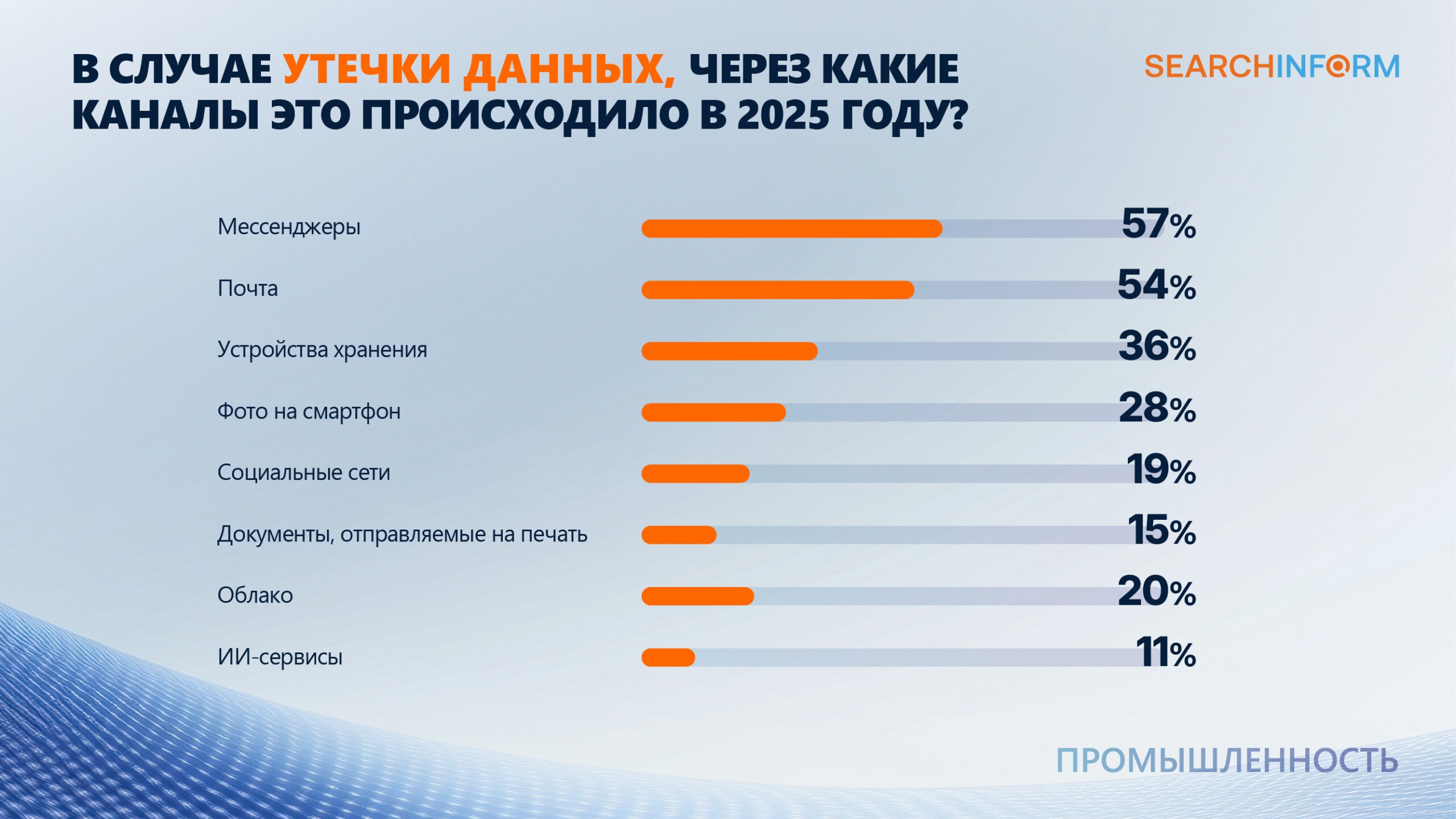 Топ-каналы, через которые сотрудники сливали информацию в 2025 году: мессенджеры (57%), почта (54%), устройства хранения (36%) и фото на смартфон (28%). В этом году ИИ-сервисы редко становились каналом утечки конфиденциальных данных, лишь 11% организаций сталкивались с такими инцидентами.*