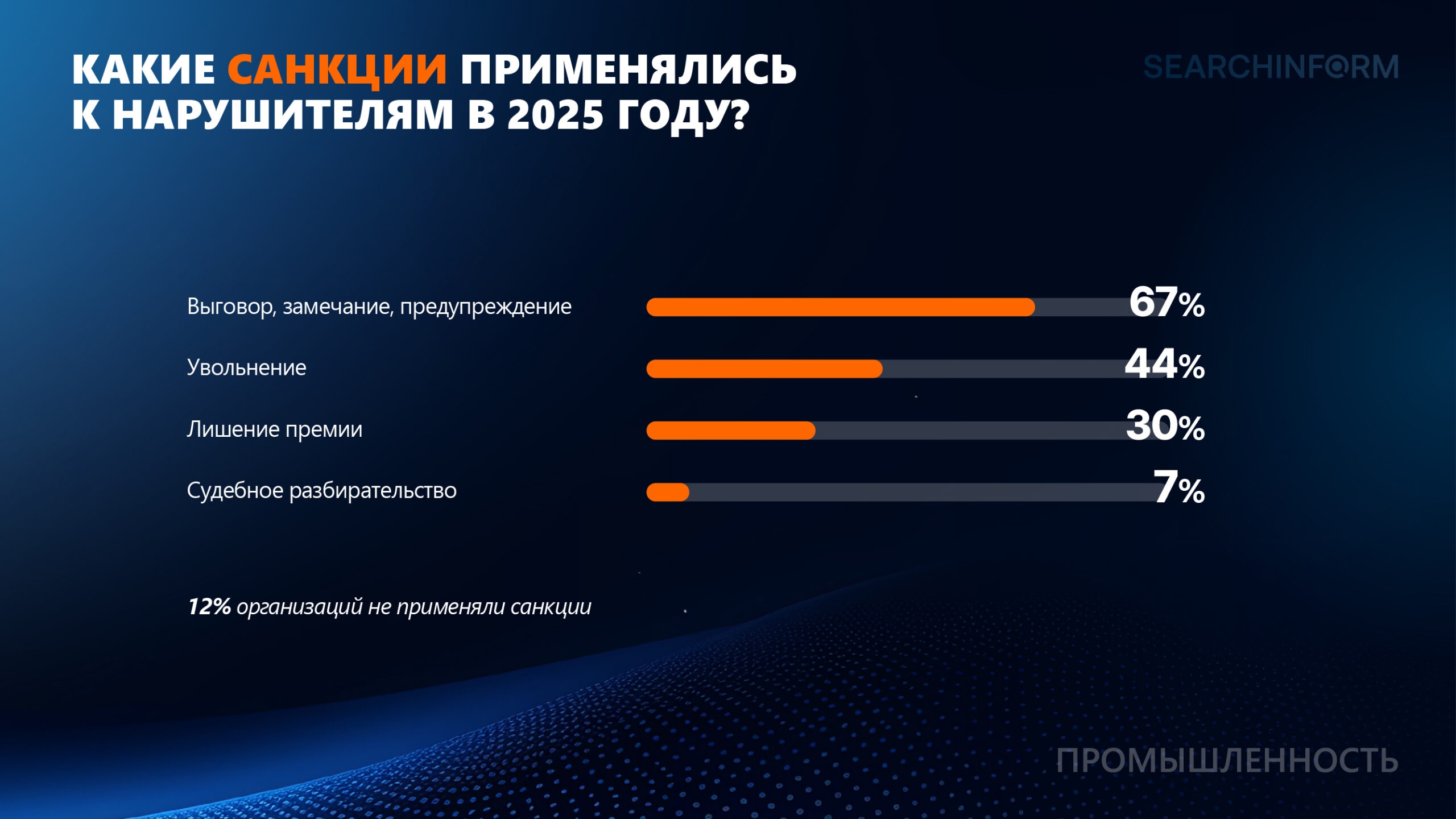 Большинство промышленных организаций, столкнувшихся с ИБ-инцидентами, выносили нарушителям выговор, предупреждение или замечание (67%). Санкции в виде увольнения применяли к нарушителям почти половина (44%) компаний. Доводили инцидент до суда лишь 7% опрошенных компаний. 12% работодателей никак не наказывали нарушителей.*