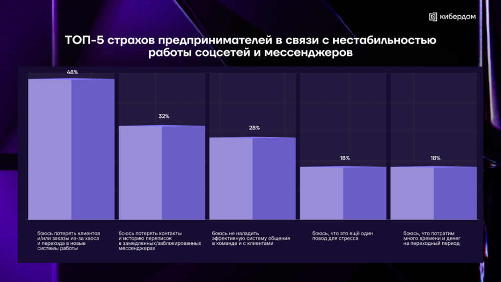 Однако даже при наличии таких факторов поддержки предприниматели продолжают сталкиваться с рядом рисков. Многие страхи предпринимателей связаны с сохранностью и безопасностью данных. Треть (32%) боится потерять контакты, данные клиентов и историю переписки в замедленных и заблокированных мессенджерах. Еще 14% опасаются утечки данных из-за использования сотрудниками альтернативных каналов общения. Тревожность предпринимателей усугубляет и нехватка информации — 16% боятся в этих условиях что-нибудь упустить, но не знают, что конкретно.