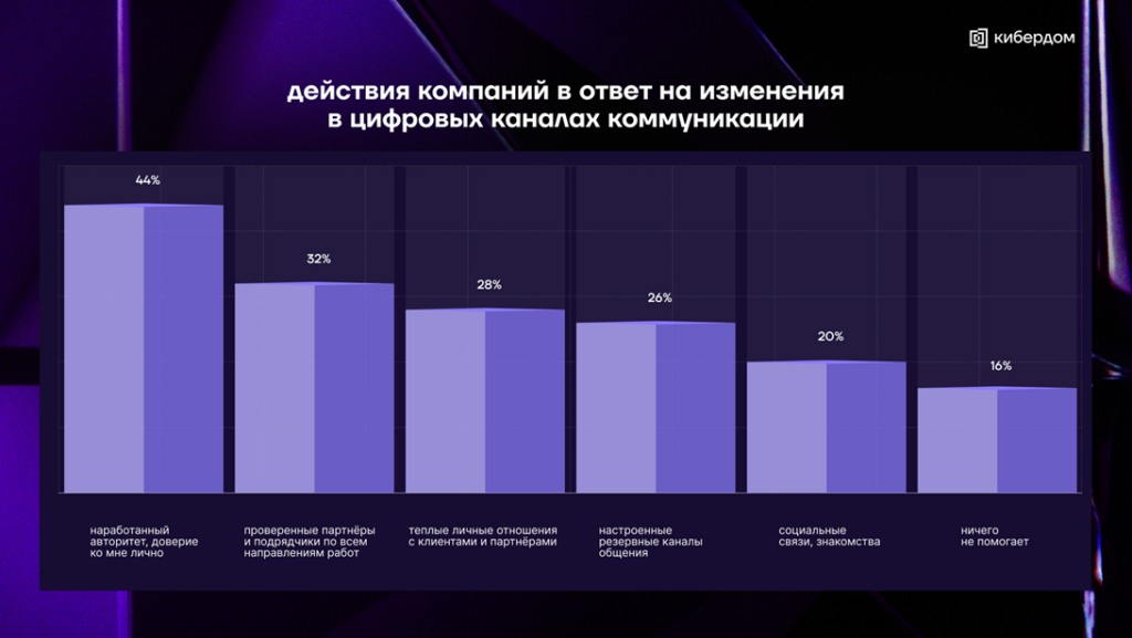 Только четверть предпринимателей чувствуют себя уверенно, так как уже настроили резервные каналы коммуникации. Большинству справиться с тревогой помогают не только технологии, но и личные связи: наработанный авторитет и доверие (44%), проверенные партнеры и подрядчики (32%), теплые личные отношения с клиентами (28%). Каждый пятый (20%) опирается на социальные связи и знакомства, каждый седьмой (14%) — на надежную команду. Однако 16% участников опроса признались: им ничего не помогает чувствовать себя спокойнее.