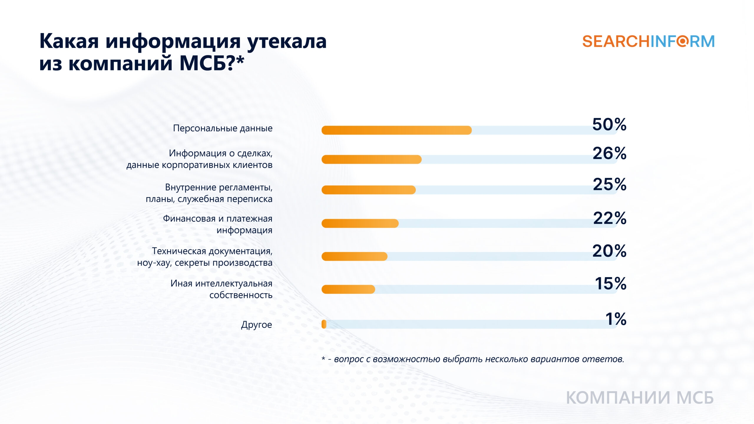 Чаще всего инсайдеры передавали за пределы компании персональные данные – такую информацию сливали в 50% случаев. Также значительную часть в утечках составляли информация о сделках и данные корпоративных клиентов (26%), внутренние регламенты и служебные переписки (25%)*.