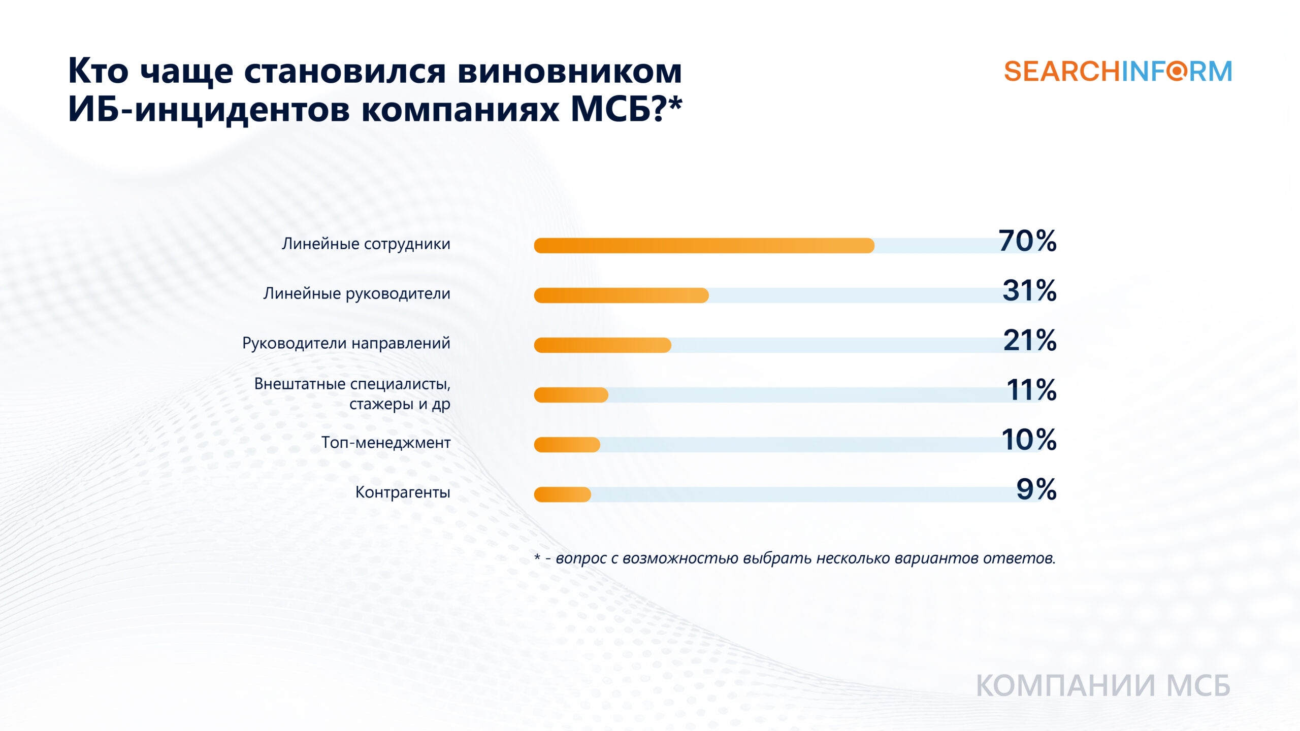 В 2025 году линейные сотрудники являлись основными виновниками инцидентов: в 70% всех инцидентов. Реже нарушителями становились линейные руководители (31%) и руководители направлений (21%).*