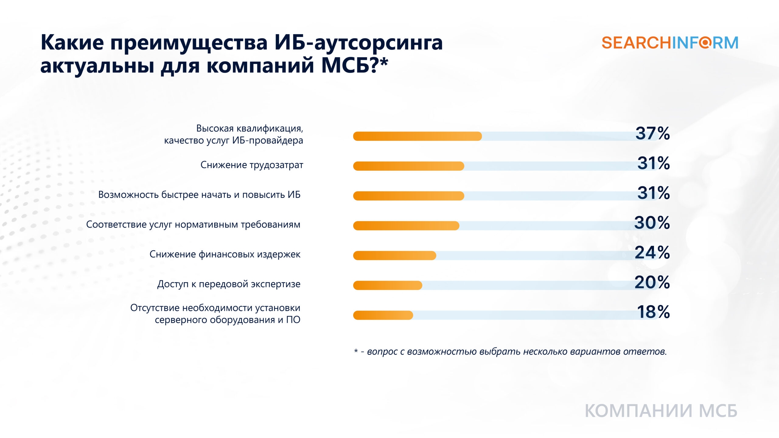 Действующие заказчики ИБ-аутсорсинга среди ключевых преимуществ выделяют: высокую квалификацию и качество услуг ИБ-провайдера (37%), снижение трудозатрат (31%) и возможность быстрее повысить уровень ИБ (31%).*