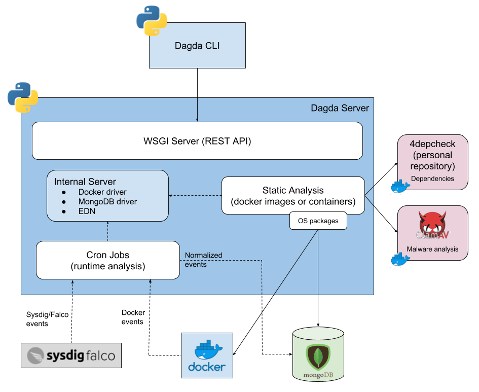 Dagda – это инструмент с открытым исходным кодом для статического анализа известных уязвимостей, таких как трояны, вредоносные программы, вирусы и т.д. в образах и контейнерах docker. Он использует антивирусный движок ClamAV для обнаружения таких уязвимостей.