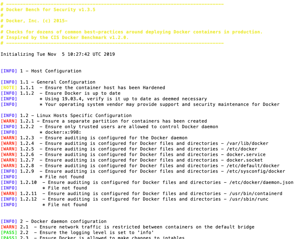 Docker Bench Security – это скрипт с несколькими автоматизированными тестами для проверки лучших практик развертывания контейнеров в рабочей среде.