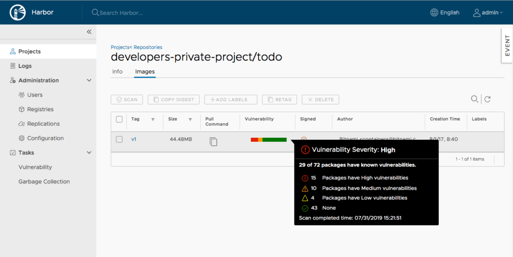 Если обнаруживается какая-либо уязвимость, Aqua Security сообщает о ней разработчикам и показывает рекомендации того, что нужно сделать, чтобы ее исправить.