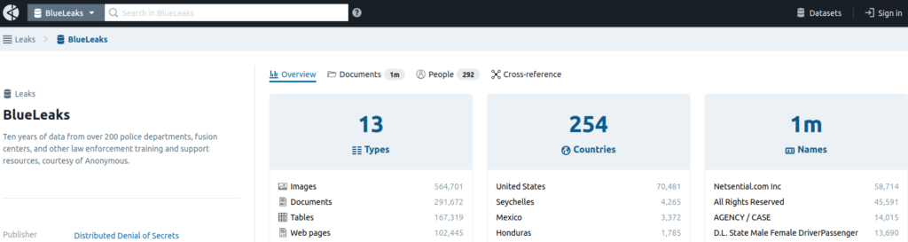 Ответственность за слитую информацию на себя взяла группа DDoSecrets, которая в своем твиттер-аккаунте сообщила о том, что архив BlueLeaks содержит данные более чем о 200 полицейских управлениях, образовательных центрах полиции, организациях поддержки полиции за последние 200 лет. В слитом архиве также есть конфиденциальная информация о полицейских отчетах, деятельности ФБР, бюллетени, руководства, инструкции и многое другое.