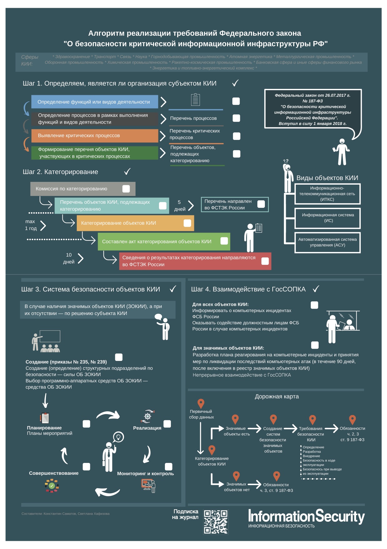 В журнале Information Security/Информационная безопасность №3, 2020 опубликован следующий постер с алгоритмом реализации требований Федерального закона 187-ФЗ О безопасности критической информационной инфраструктуры РФ.