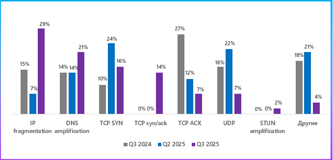 Самый заметный рост показал тип атак IP fragmentation: с 7% во втором квартале до 29% – это почти четырехкратное увеличение и возврат к тренду низкоуровневых сложных атак. Аналогичная динамика у TCP SYN/ACK, которого не было в статистике ранее (0% в 2024 и во втором квартале 2025 года), но во втором квартале он сразу занял 14%.
