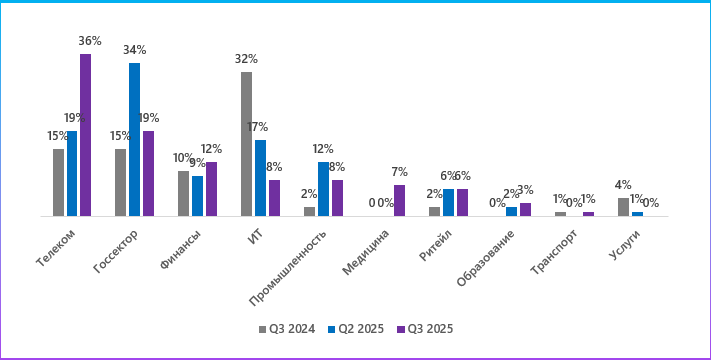 В третьем квартале 2025 года распределение DDoS-атак по отраслям заметно изменилось по сравнению как с предыдущим кварталом, так и с тем же периодом 2024 года. Резкий рост зафиксирован в телеком-секторе: с 15% год назад и 19% во втором квартале 2025 года до 36% в третьем квартале – это крупнейший показатель среди всех отраслей. Уровень атак на госсектор, который был самым высоким в предыдущем квартале (34%), снизился до 19% и приблизился к показателям прошлого года (15%). В четыре раза за год снизилось количество DDoS-атак на ИТ-сектор: с 32% в Q3 2024 до 8% в Q3 2025.