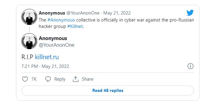 Группировка хактивистов Anonymous в своих социальных сетях заявила об объявлении кибервойны пророссийской хакерской группе Killnet, которая проводит безостановочные атаки на организации и госучреждения западных стран.