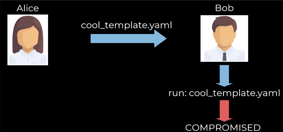 Для начала определим векторы атаки, которые доступны Алисе. Первый и самый очевидный – локальный, если Алиса каким-то образом подменит легитимный шаблон или убедит Боба запустить вредоносный шаблон, который совершит какие-либо небезопасные действия.