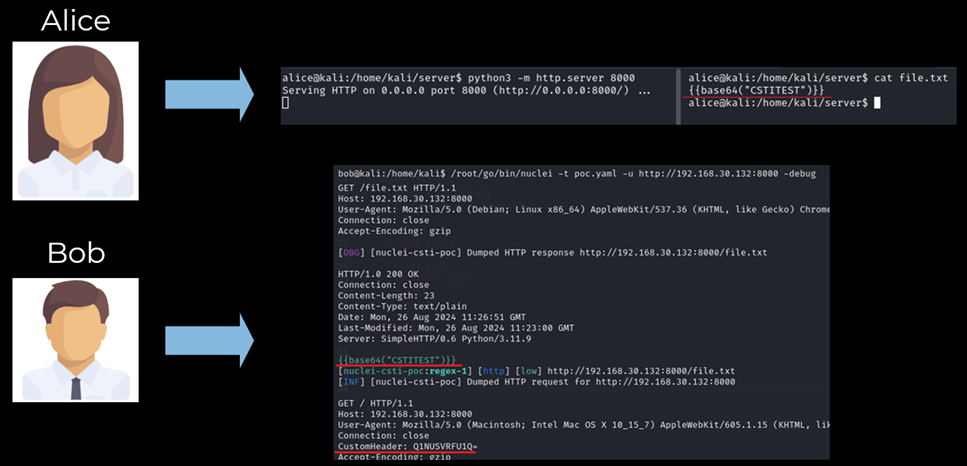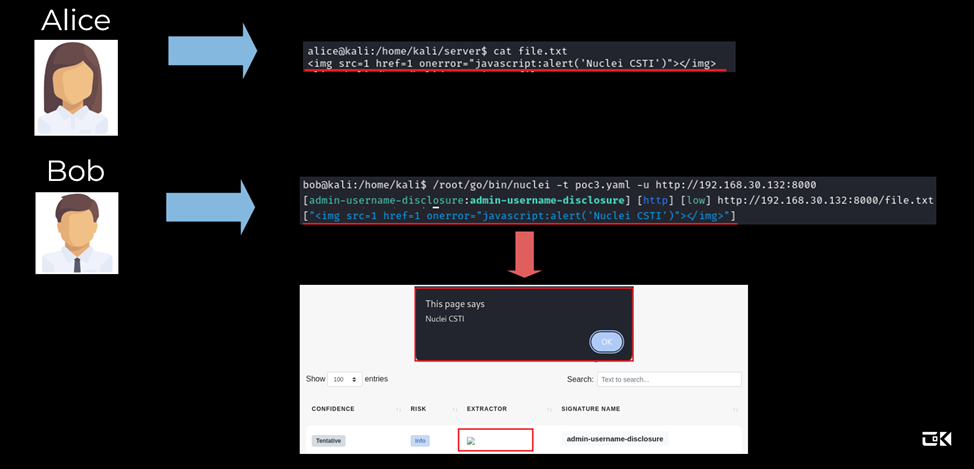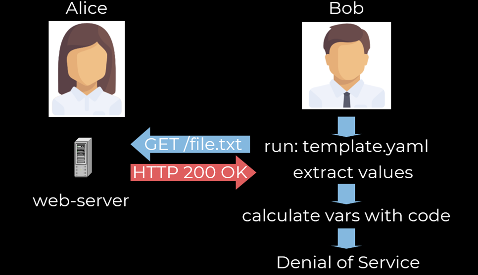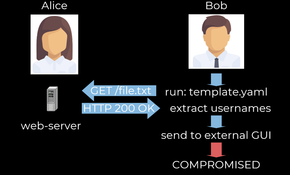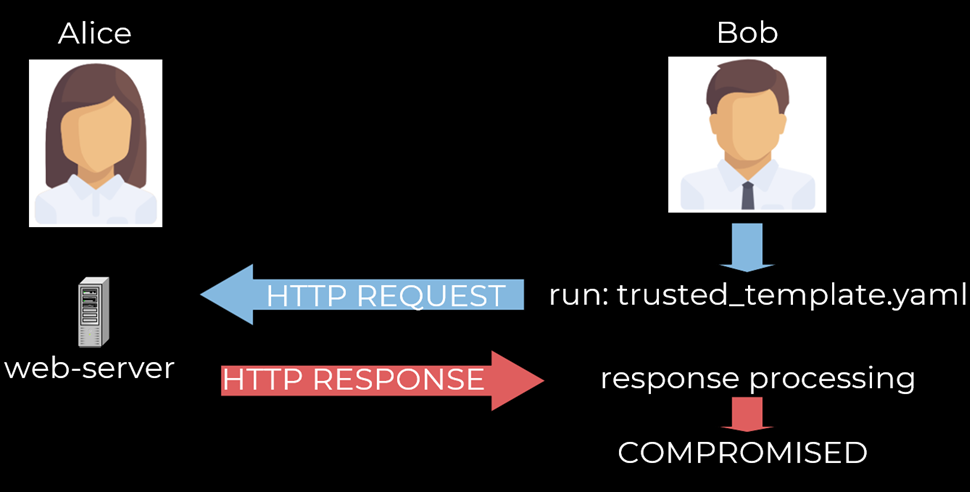 Второй вектор – сетевой. Когда Боб запускает, казалось бы, легитимный шаблон, совершается запрос к серверу Алисы, но ответ сервера, благодаря специфике работы Nuclei, приводит к каким-то негативным последствиям.