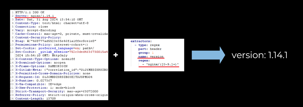 На скриншоте ниже можно увидеть пример, когда из HTTP-ответа сервера с помощью регулярного выражения извлекается заголовок Server и числовое значение (в данном случае – 1.14.1) помещается в переменную version.