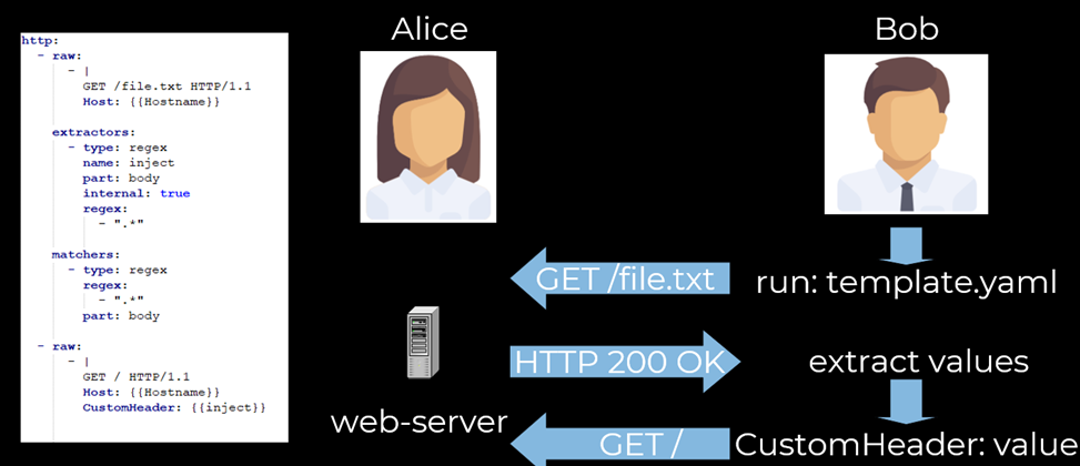 Рассмотрим другой сценарий, с актуальной версией Nuclei. Предположим, у Боба есть легитимный шаблон, который делает первый HTTP-запрос к файлу file.txt, извлекает из тела ответа что-то с помощью регулярного выражения и делает второй запрос, подставляя в заголовок CustomHeader извлеченное значение.