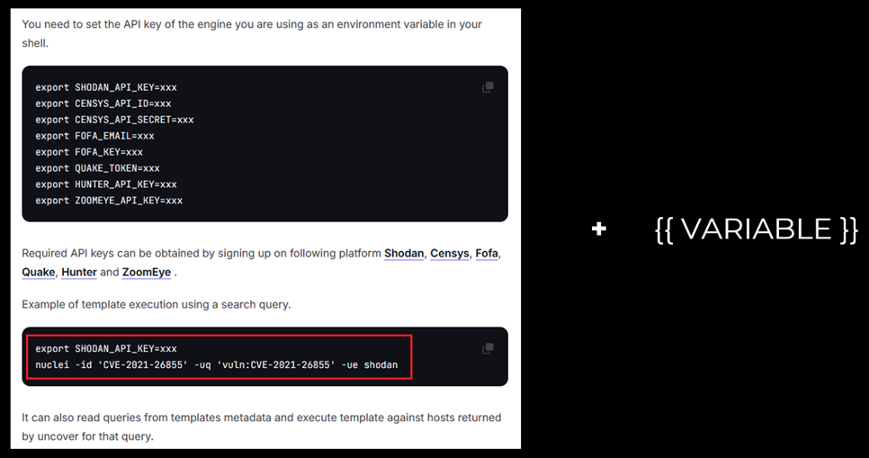 В одном из последних обновлений Nuclei была добавлена интеграция с ASM-системами – такими, как Shodan, Netlas, Fofa и пр. Для того, чтобы найти хосты, подверженные определенной уязвимости и запустить их сканирование с помощью Nuclei, в официальной документации ProjectDiscovery есть соответствующая инструкция, в которой API ключи для ASM просто импортируются в переменные среды.
