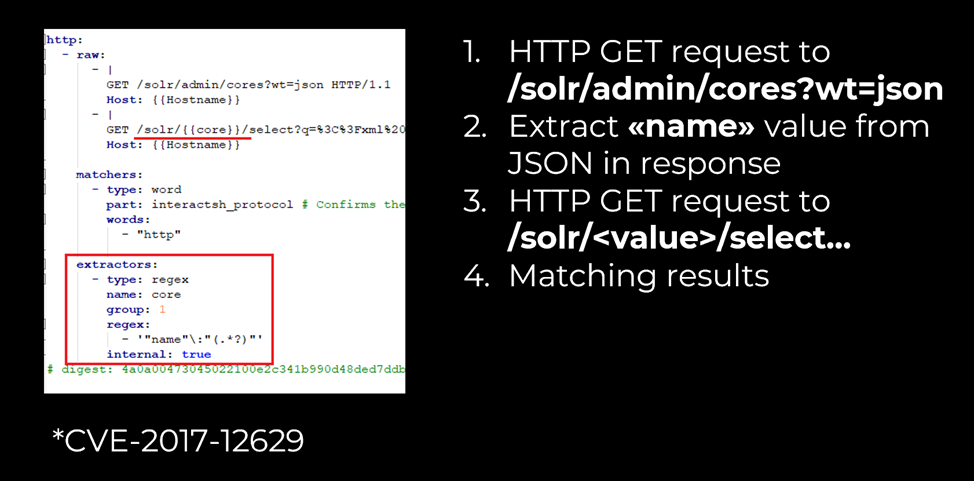 Для начала нужно определиться, что Алиса вообще может внедрить и куда. Учитывая, что Nuclei должен взять ответ сервера Алисы и как-то использовать, наиболее вероятным местом атаки являются экстракторы.