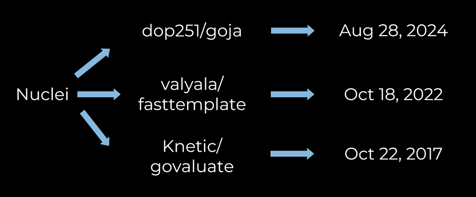 При этом, вектор я бы оценил как очень перспективный, так как у Nuclei внутри используется несколько общедоступных библиотек. Некоторые из них обновляются регулярно (как goja), а вот некоторые, как, например, отвечающие за вычисления в экстракторах или подстановке значений в шаблонах, выглядят заброшенными – от 2 до 7 лет, а значит, могут содержать баги или ошибки в логике.