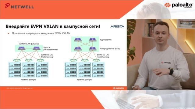 Совместный доклад с Arista Networks. Рассказали про варианты селективной инспекции трафика, Zero Trust сегментации, NGFW в фабриках EVPN VXLAN, multisite-дизайн. Содержание: 00:00:00 — В начало 00:01:28 — Макро- и Микросегментация. EVPN VXLAN нам в помощь 00:08:34 — EVPN VXLAN в кампусной сети 00:17:41 — Сегментация в Кампусе 00:34:48 — Ответ на вопрос про проверку трафика […]
