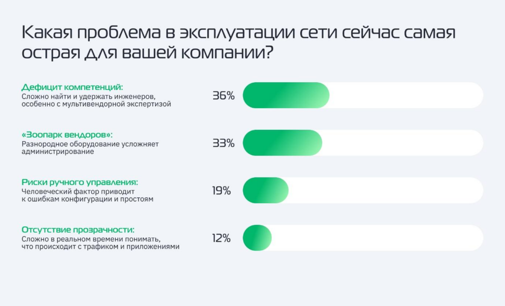 Острая нехватка квалифицированных ИТ-кадров (36%) напрямую связана с масштабной перестройкой ИТ-ландшафта. Треть опрошенных компаний (33%) признают, что управление инфраструктурой критически усложнилось из-за образовавшегося «зоопарка вендоров» — одновременного использования российского, азиатского и западного оборудования. В таких условиях традиционное ручное управление сетью становится все более рискованным: 19% респондентов отмечают, что человеческий фактор все чаще приводит к ошибкам конфигурации и простоям. Еще 12% указали на отсутствие прозрачности в управлении сетью. У компаний появляются новые сервисы, усложняется маршрутизация, добавляются гибридные структуры. Отследить все это вручную, без использования инструментов мониторинга ИТ-инфраструктуры крайне сложно.