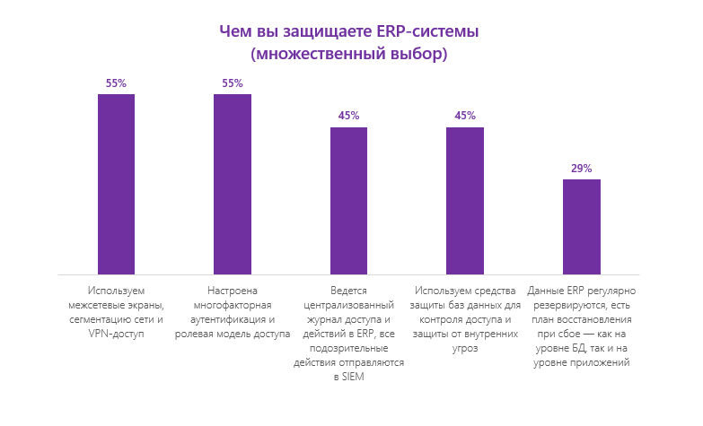 Российские компании продолжают укреплять защиту ERP-систем – базовые меры уже стали стандартом, но многие до сих пор не формируют комплексный подход. По данным опроса*, организации в равной степени полагаются на сетевые барьеры и контроль доступа: 55% участников используют межсетевые экраны, сегментацию сети и VPN и столько же применяют многофакторную аутентификацию и ролевую модель.