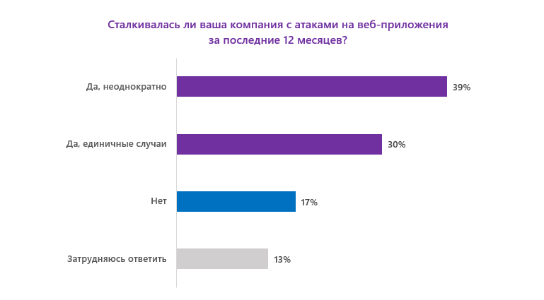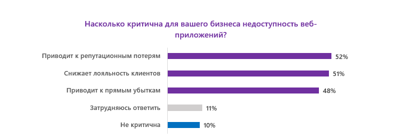 Для 79% компаний недоступность веб-приложений критична. Нарушения в работе ведут к прямым убыткам и потере доверия клиентов, что превращает защиту приложений в задачу бизнеса, а не только службы ИБ.