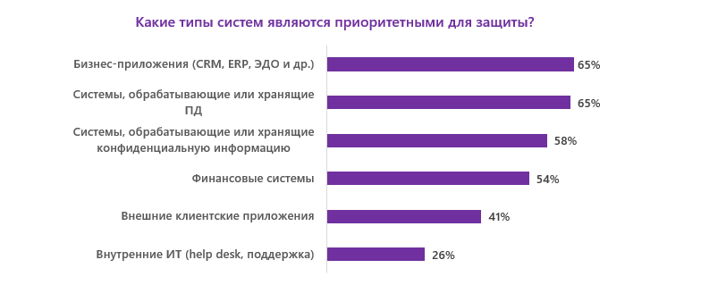 Наибольшее внимание организации уделяют защите CRM, ERP, ЭДО и систем, работающих с персональными и конфиденциальными данными.
