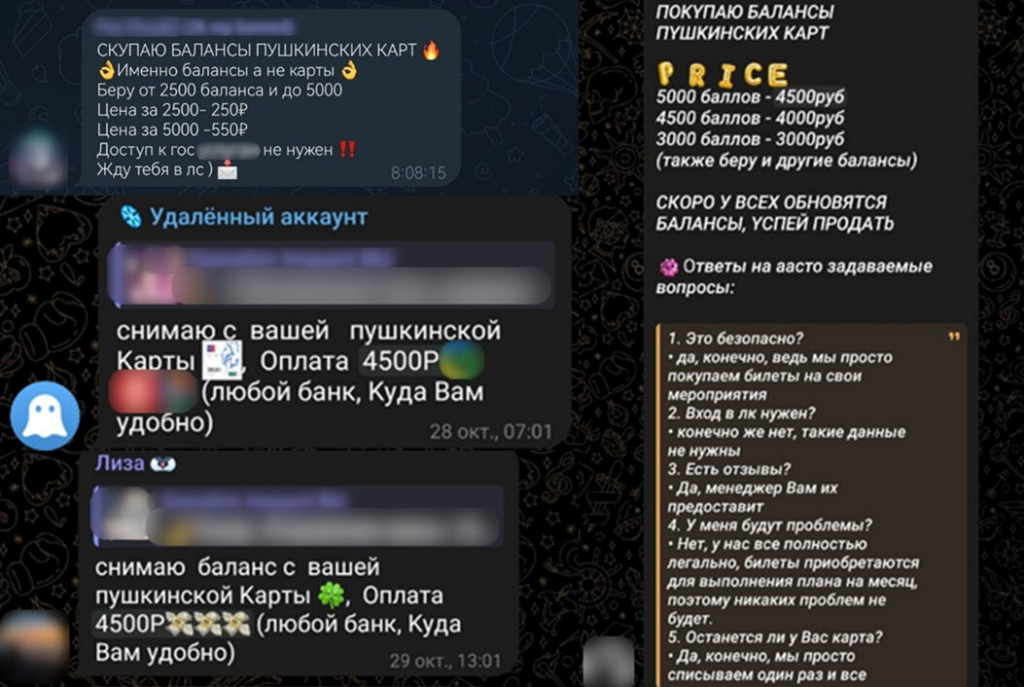 Скупка Пушкинских карт. Для привлечения пользователей используют ботов, которые первыми оставляют комментарии под постами. Злоумышленники прямым текстом предлагают обналичить карту (злоумышленники пишут «снять баланс»). За объявлениями могут скрываться как мошенники, которые пытаются обналичить Пушкинские карты через формальное проведение культурных мероприятий, так и скамеры. Под предлогом перевода «вознаграждения» за использование Пушкинской карты они могут попросить сообщить реквизиты банковской карты пользователя, чтобы списать с неё деньги.