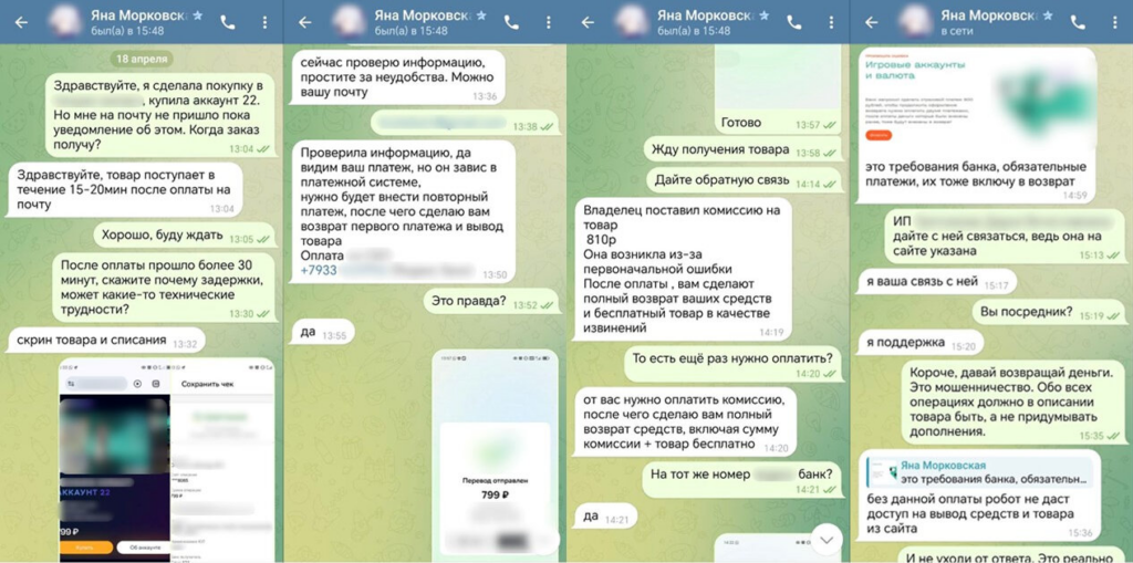 Скам на продаже игровых аккаунтов. На популярных площадках злоумышленники размещают объявления о продаже игровых аккаунтах. Покупатель оплачивает стоимость, видит статус «товар отправлен» и ожидает получения доступа к аккаунту. Но сразу после оплаты мошенник в переписке сообщает, что платёж якобы заморожен из-за технической ошибки, и требует сначала повторный перевод, затем – оплатить комиссию, страховку, разблокировку.