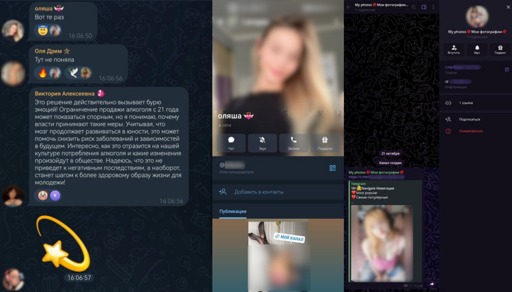 Медовая ловушка. В роли приманки выступают боты-комментаторы с откровенными фотографиями на аватарках. В профиле размещена ссылка на Telegram-канал, в котором предлагают вступить в приватную группу с контентом 18+, эротические чаты или приобрести интимные фото и видео моделей. Особая опасность таких ботов – в том, что они массово атакуют практически все популярные каналы. Эта схема опасна не только потерей денег. Злоумышленники могут шантажировать детей тем, что сообщат родителям или в школу / полицию о «переписке на взрослые темы», и вынуждать их раскрыть личные данные.