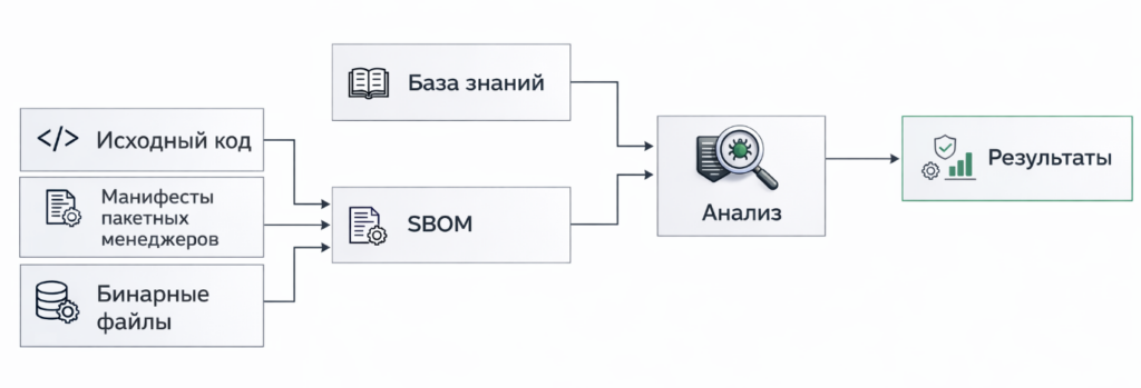 Их задача — автоматически собирать информацию об используемых библиотеках, находить известные уязвимости и проверять лицензионную чистоту. На выходе мы получаем Перечень Программных Компонентов (ППК) — он же SBOM (Software Bill of Materials). Это детализированный документ, где по каждому компоненту указаны идентификатор, версия, ссылка на исходники, найденные уязвимости и рекомендации по исправлению.