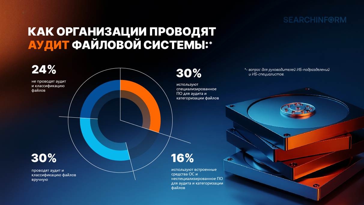 Проблема безопасного хранения конфиденциальной информации в цифровом формате остается актуальной для российских организаций. 24% опрошенных не проводят аудит файловой инфраструктуры, а 30% специалистов проводят эту процедуру вручную. Это увеличивает риск ИБ-инцидентов, поскольку для полноценной защиты данных ИБ-отделу нужна актуальная информация о том, где хранится защищаемые файлы и кто из сотрудников имеет доступ к ним.
