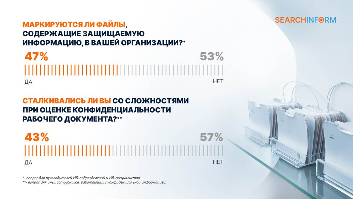 53% опрошенных сообщили о том, что в их организациях не выполняется маркировка защищаемой информации. Однако соблюдение этой процедуры для коммерческой тайны и информации ДСП обязательно в силу нормативных требований. Маркировать нужно и носители информации, и документы в бумажном и электронном формате. Несоблюдение этого требования ведет к тому, что пользователи при работе с такими сведениями допускают ошибки, которые могут стать причиной ИБ-инцидентов.