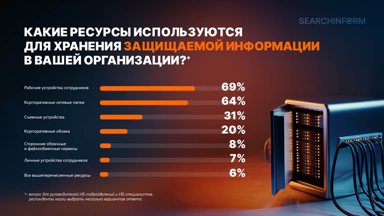 Еще один важный шаг при контроле конфиденциальной информации – организация ее защищенного хранения и обеспечение баланса между доступностью данных для работы и контролем за ними. Несмотря на то, что часть организаций хранят конфиденциальную информацию на незащищенных ресурсах (съемные носители, личные ресурсы сотрудников), большая часть (более 64%) опрошенных перешла к защищенной модели хранения данных (рабочие устройства сотрудников и корпоративные сетевые папки).