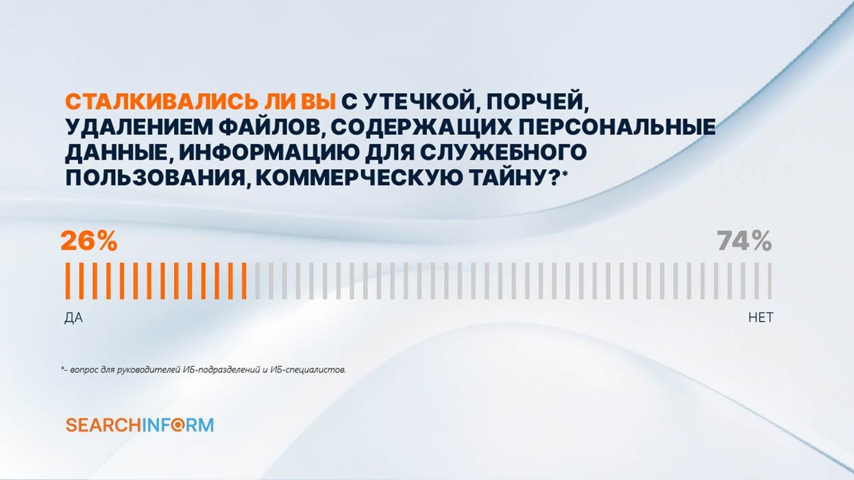 94% респондентов сообщили, что в их организациях приняты внутренние документы о работе с защищаемой информацией. При этом четверть опрошенных ИБ-специалистов столкнулась с инцидентами по вине сотрудников: утечками, порчей, удалением файлов, содержащих конфиденциальную информацию.