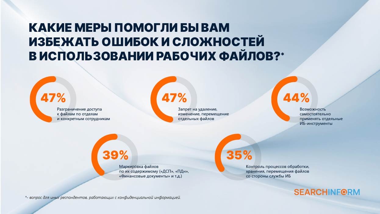 Результаты исследования показывают, что помимо регламентации процессов работы с конфиденциальными сведениями, необходимой мерой их защиты является реализация технических мер защиты информации. По мнению респондентов, это позволит предотвратить связанные с ошибками персонала инциденты и повысить ИБ-дисциплину в организациях.