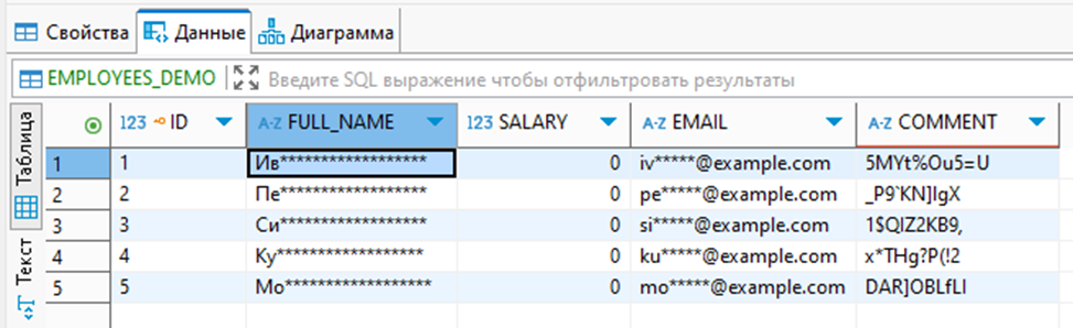 - Full Redaction: полная маскировка (числа -> 0, строки -> пробел);
