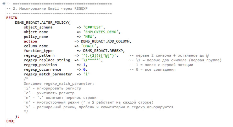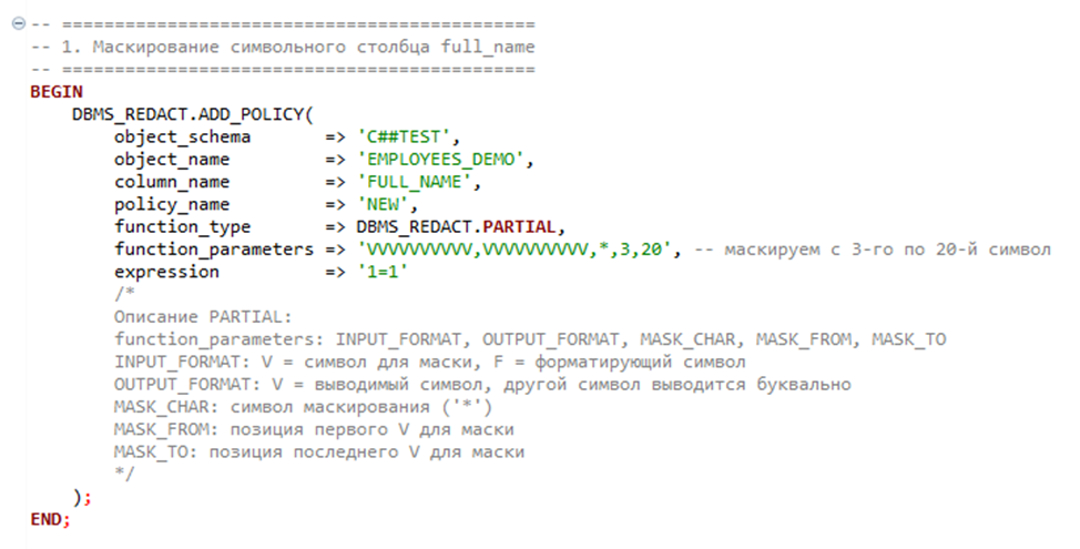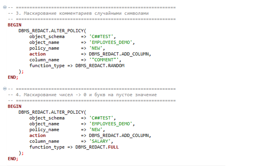 - User-defined PL/SQL functions: любые пользовательские сценарии маскирования;