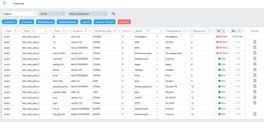 - Инвентарь для отображения структуры БД, ограничений и связей, с возможностью версионирования (для отслеживания изменений в БД и пользовательских настроек), настройкой алгоритмов, фильтрацией, выгрузкой в Excel, получения примеров (обезличенных, в том числе после применения алгоритмов маскирования, без необходимости подключения к БД);